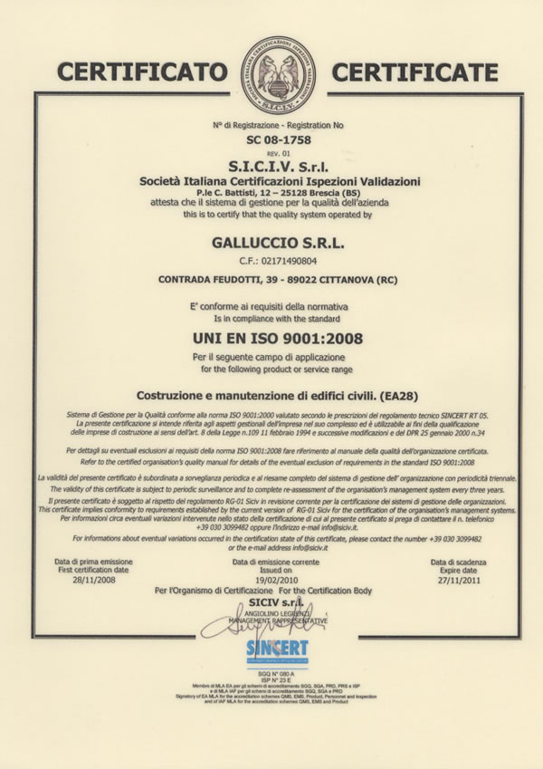 Inoltre, Galluccio Srl nel 2008 ha conseguito la certificazione qualità secondo la norma UNI EN ISO 9001:2008, per quanto riguarda la progettazione, costruzione e vendita di edifici industriali, residenziali, commerciali e direzionali.
