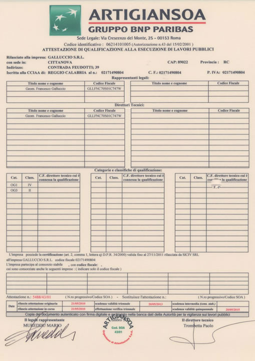 Galluccio Srl è un'azienda certificata Protos Soa, la società nata su iniziativa di Assicurazioni Generali e Sic - Società Italiana Cauzioni, che si occupa di consulenza, controlli tecnici e finanziari e project monitoring.